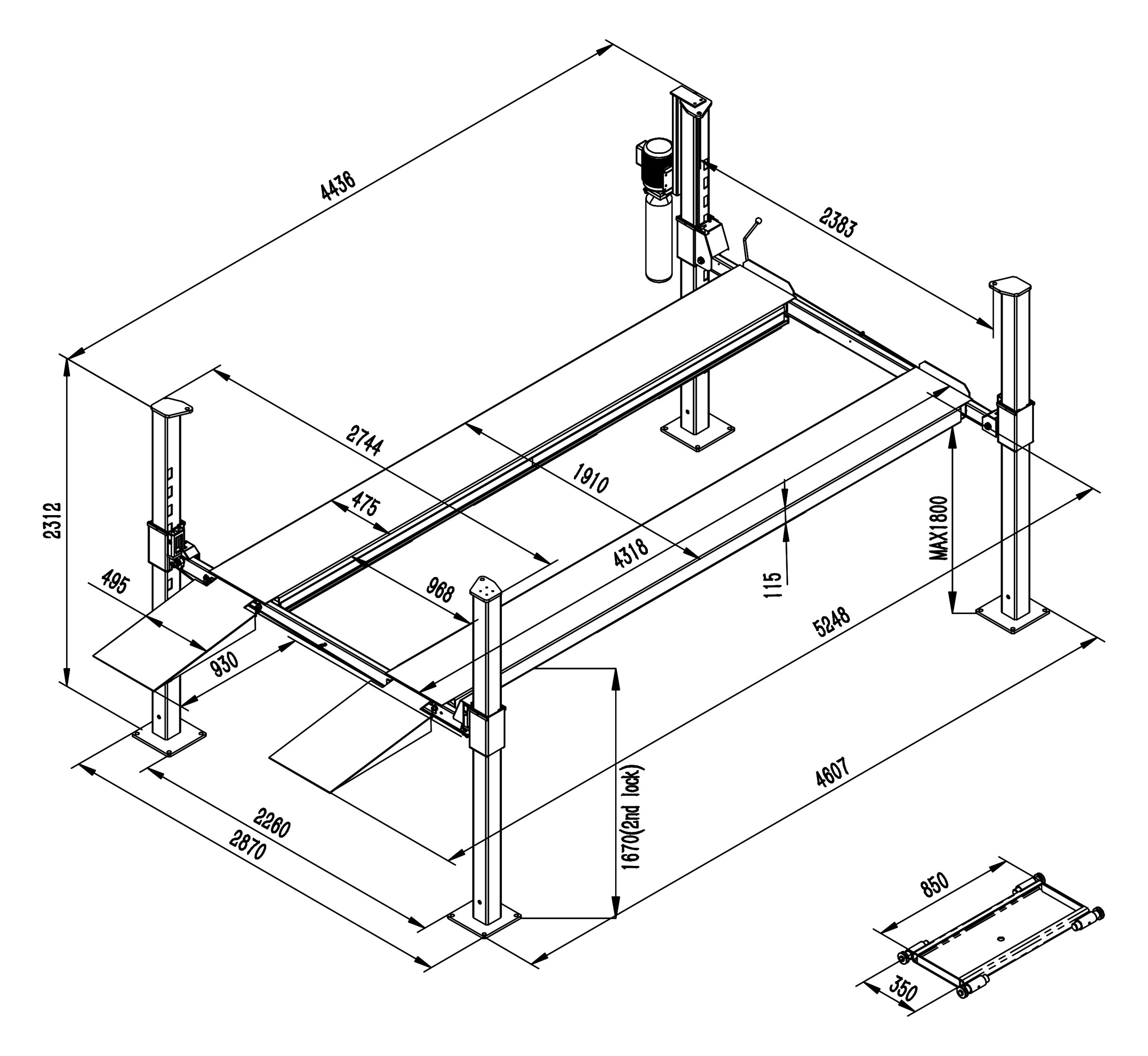 ● Slave runway adjustable to cater for various wheel base vehicles;