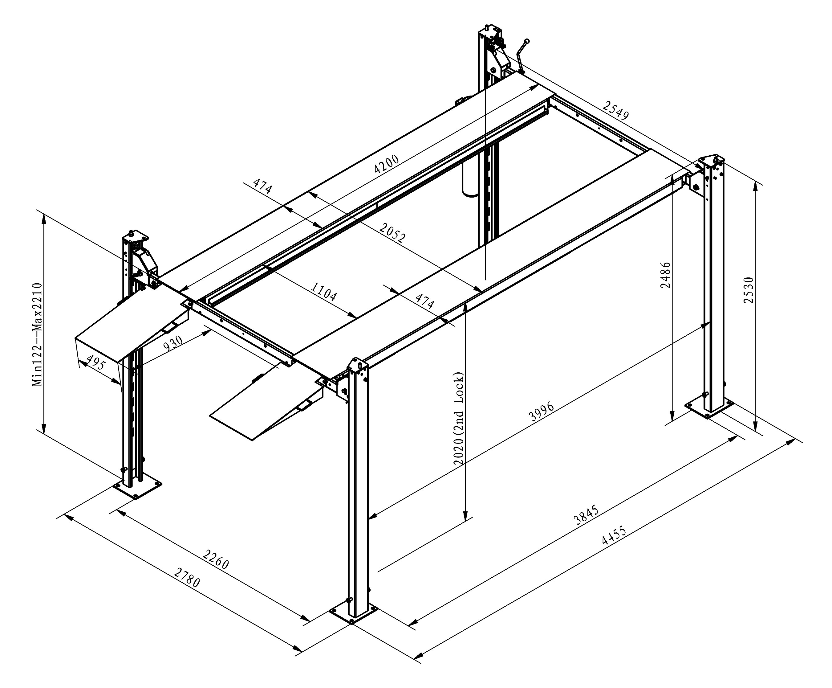 ● Slave runway adjustable to cater for various wheel base vehicles;
