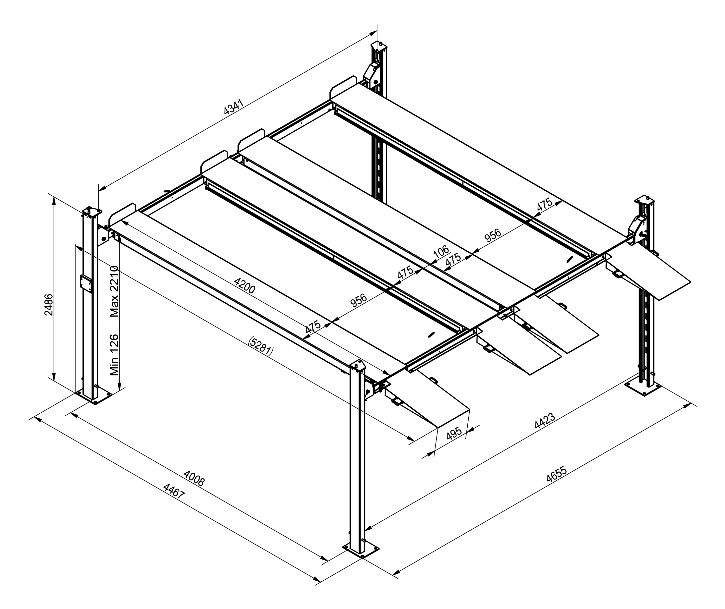 ● Slave runway adjustable to cater for various wheel base vehicles;